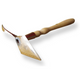 The bronze blade is sharpened on both edges. It oscillates about its brass pivot, cutting in both directions. Effectively it is a dutch hoe and draw hoe combined. A fast and efficient tool, useful for hoeing along rows and between plants and for cutting out roots. If chosen it is supplied with a limewood handle. The blades are bolted on and can be replaced when worn down.